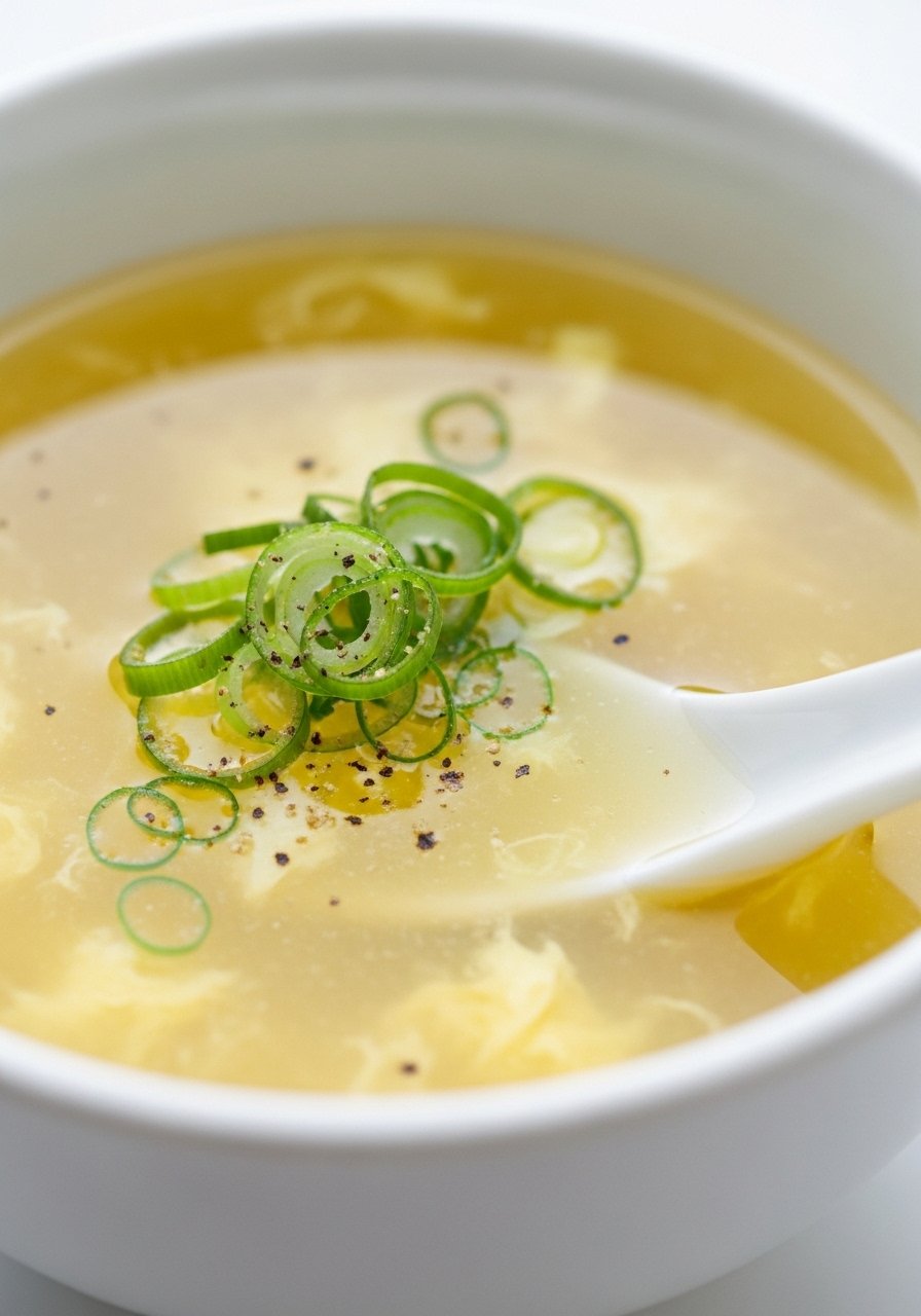 - Slowly drizzle beaten egg while stirring to create ribbons.
