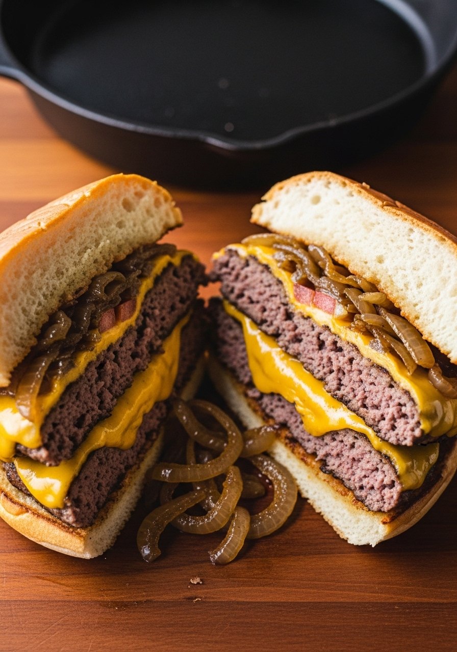 Two thin patties stack for that restaurant heft while staying budget-friendly. Caramelized onions add sweet depth, balancing the salty cheese. This is a favorite when you want extra melty cheese without buying pricier meat.