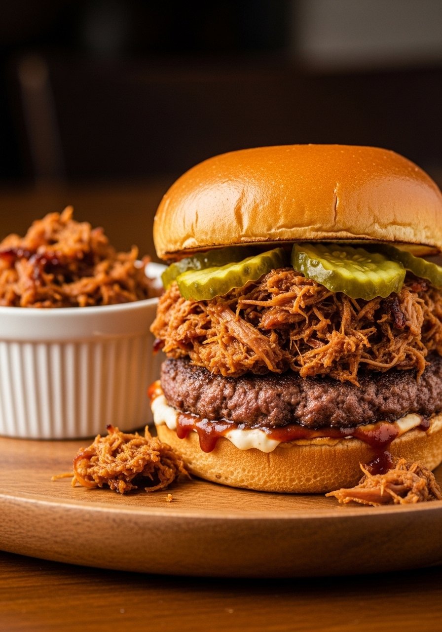 Stretch your meat budget by topping a smash patty with a bit of pulled pork. A little pork goes a long way for big flavor and a hearty mouthful.