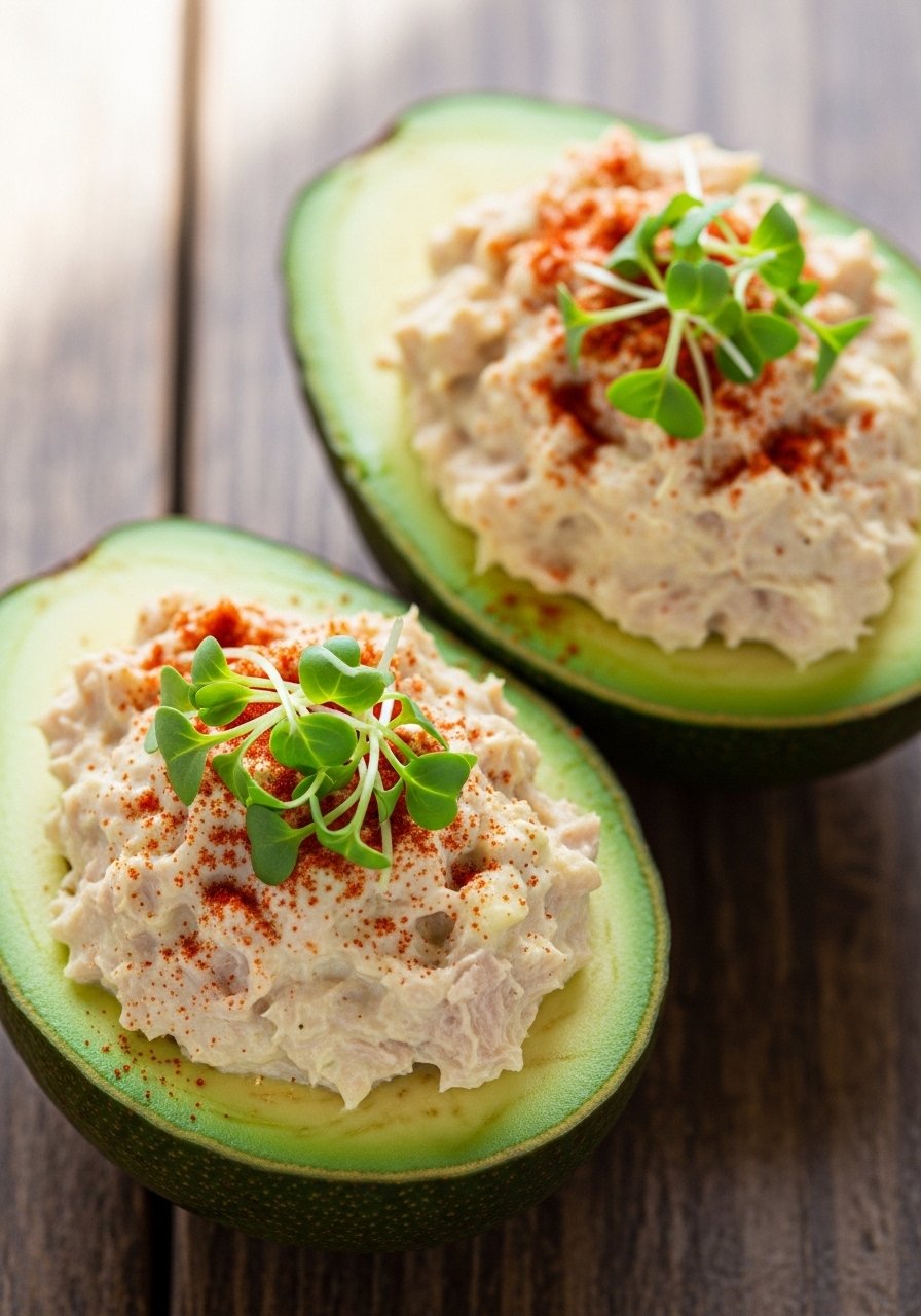 This low-carb option uses avocado halves as edible bowls. The creamy avocado pairs with tuna’s savory notes for a rich, satisfying bite. It’s quick, looks fancy, and feeds one or two easily.