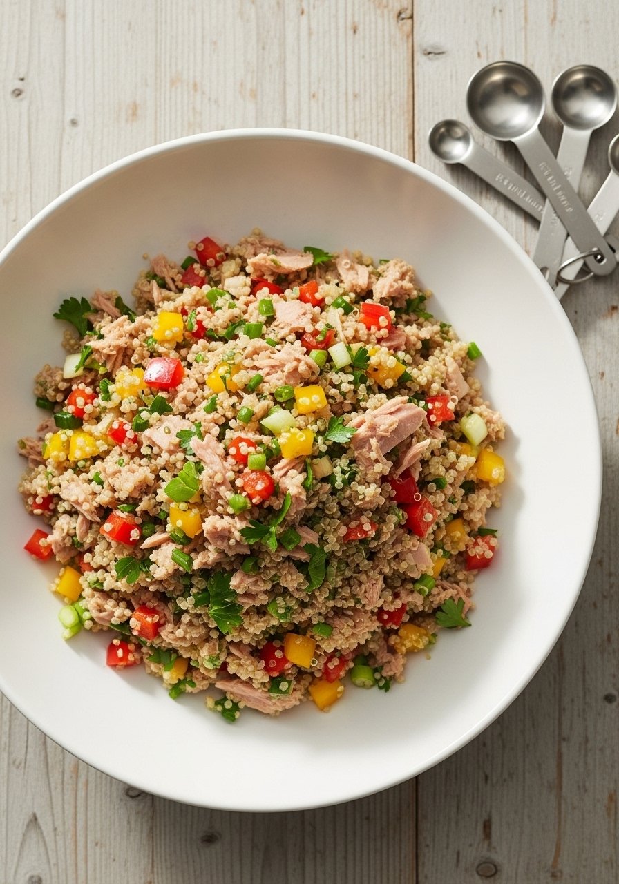- Toss cooked quinoa with tuna, bell pepper, cucumber, parsley, and dressing.