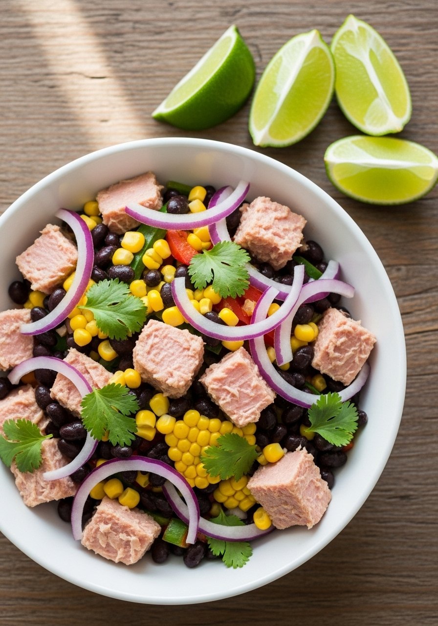 - Toss tuna, black beans, corn, and red onion with dressing.