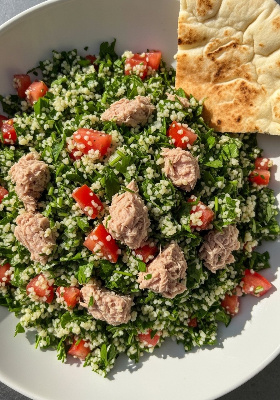 - Toss bulgur with parsley, tomatoes, mint, green onion, and tuna.