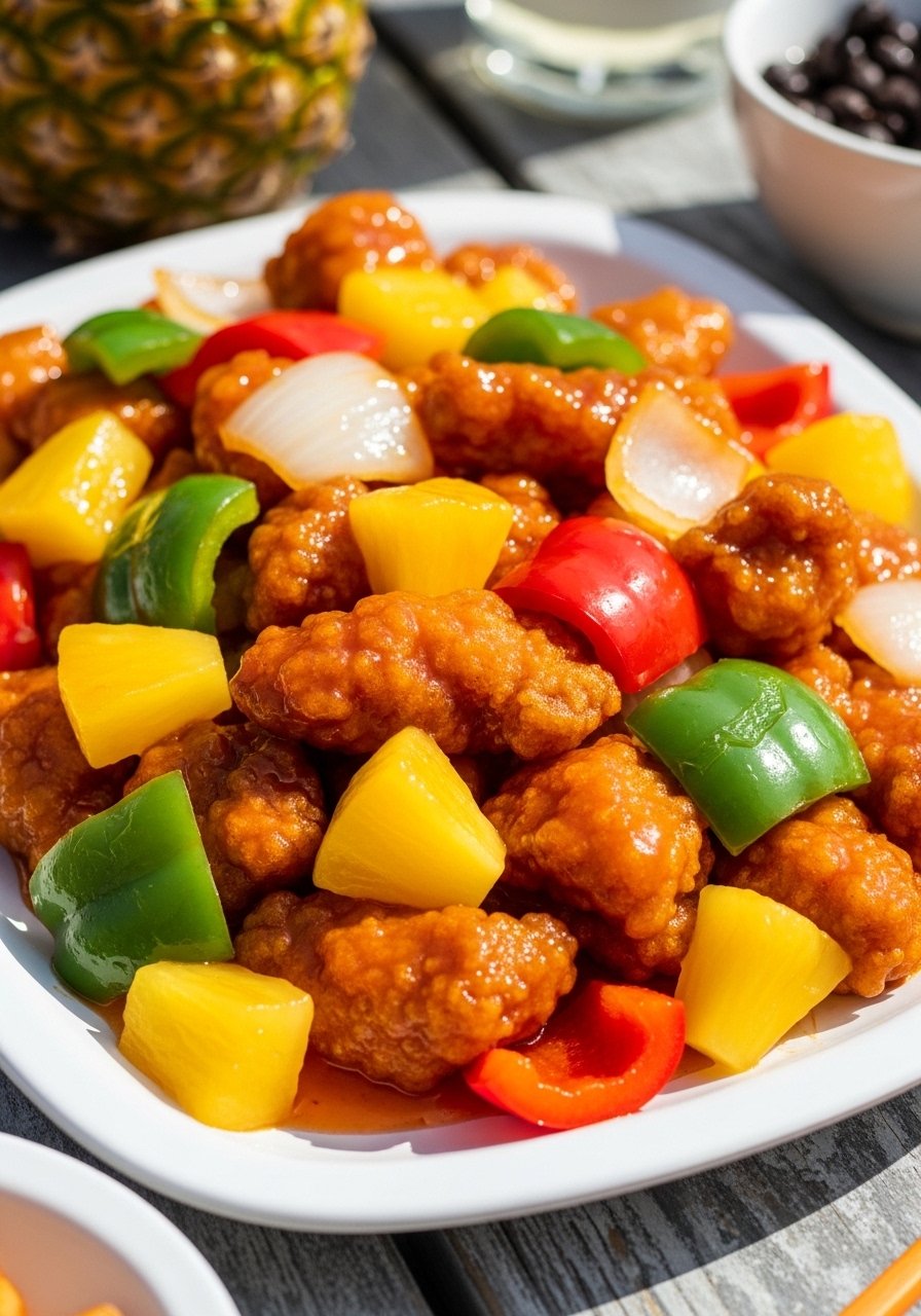 This sweet and sour version is balanced—tangy vinegar, sweet pineapple, and crisp bell peppers. Lightly battered chicken pieces fry up tender and are tossed quickly in the syrupy sauce. A deep fryer thermometer helps maintain oil temperature.
