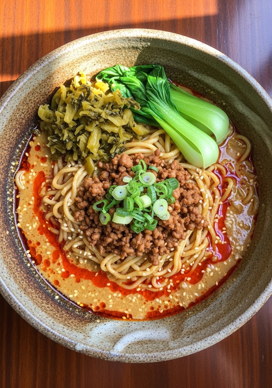 Dan Dan noodles are spicy, nutty, and savory with a peppery finish. The key is a rich sesame-peanut sauce and well-seasoned ground pork. A food processor speeds up the sauce making.
