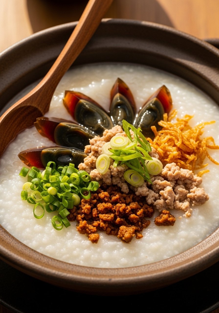 Congee is a soothing rice porridge—customize the thickness and toppings. This savory version with pork and century egg is comforting for breakfast or anytime. Use a heavy-bottomed pot or slow cooker.