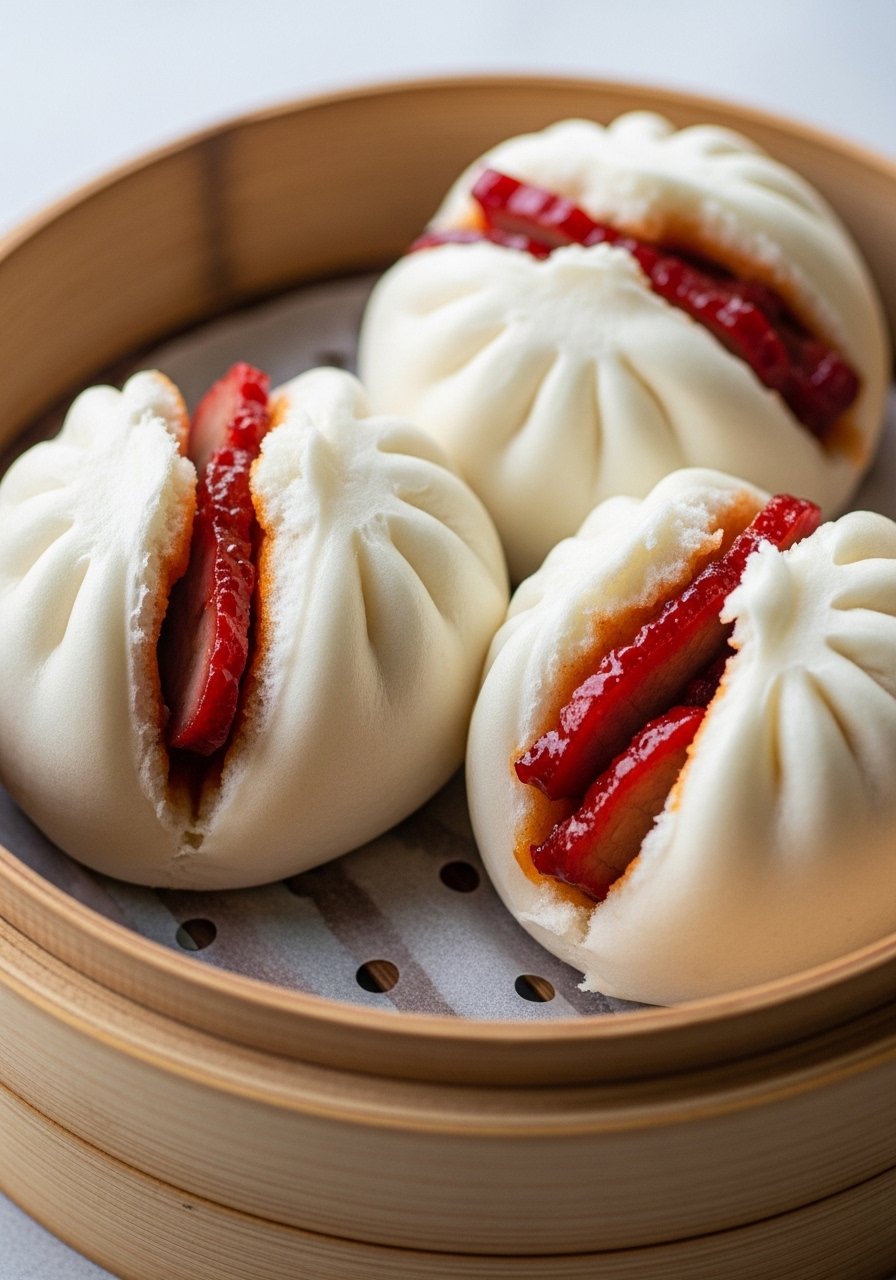 Serve fresh from the steamer. Leftover buns keep in the fridge 2 days or freeze; re-steam frozen buns for 10 minutes. Use a paring knife to portion char siu.