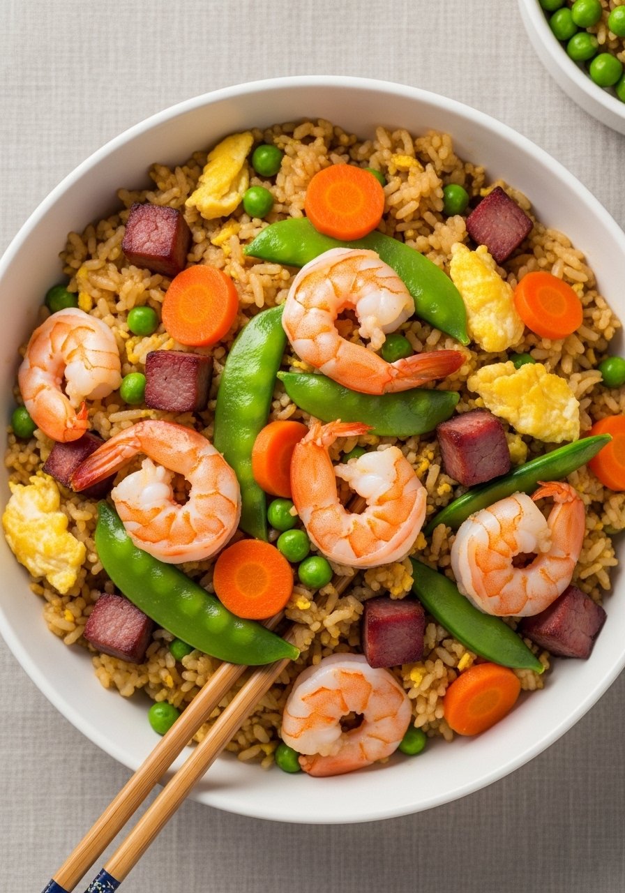 Yangzhou fried rice is a classic Cantonese fried rice loaded with shrimp, char siu, and eggs—lightly sauced and full of texture. As with other fried rice recipes, use day-old rice for best results. A wok spatula helps toss everything evenly.