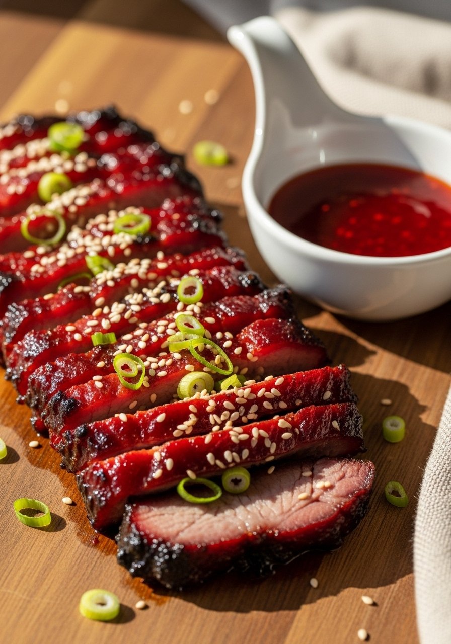 Serve sliced char siu over steamed rice or in bao buns. Garnish with sliced scallions and sesame seeds. It pairs beautifully with pickled cucumbers and a light green tea. Store leftovers in airtight containers in the fridge for up to 4 days. Reheat slices quickly in a cast iron skillet to revive the glaze.