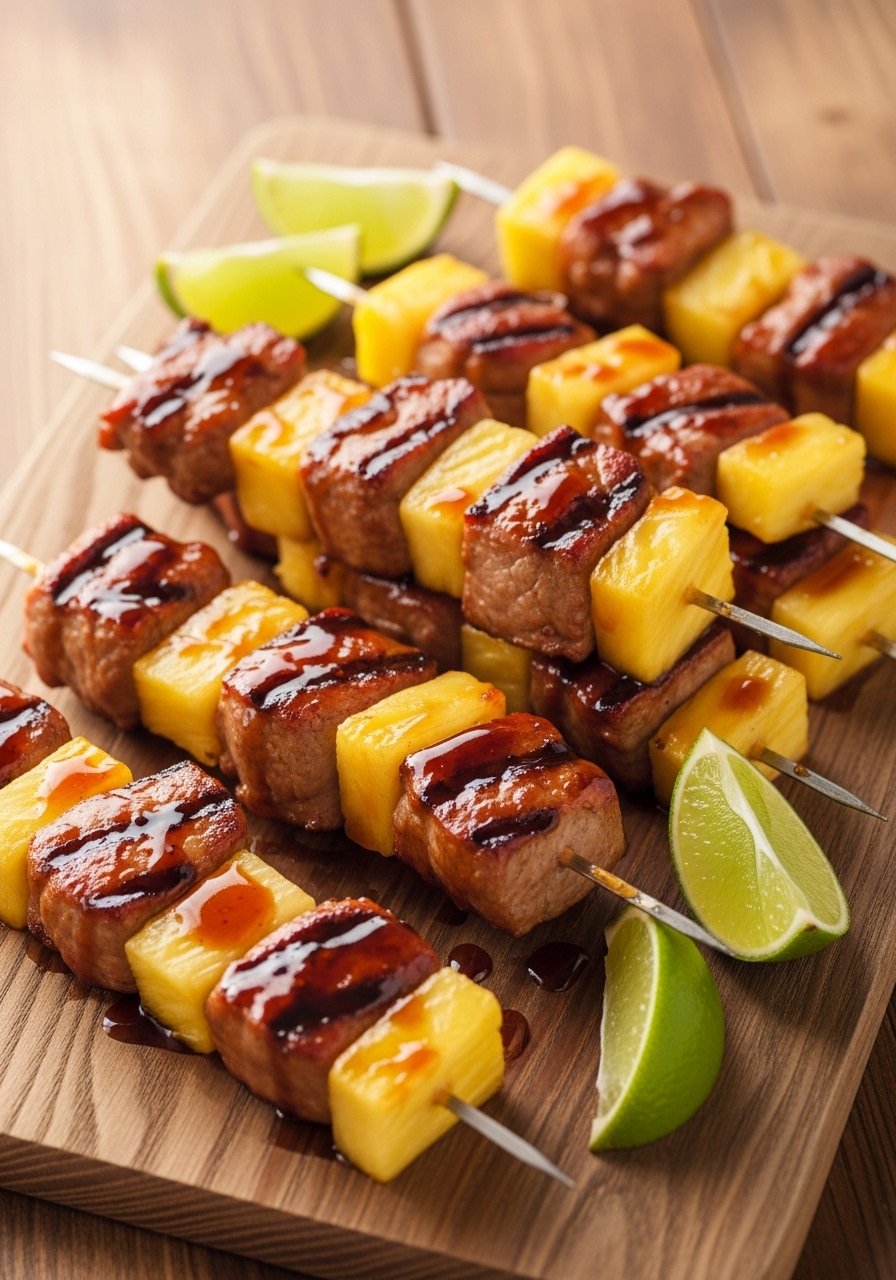 Sweet pineapple caramelizes with hoisin glaze for tropical sticky skewers. They’re bright, juicy, and grill-ready. Pineapple adds acidity that helps tenderize the pork. Use a grill torch for finishing charring.