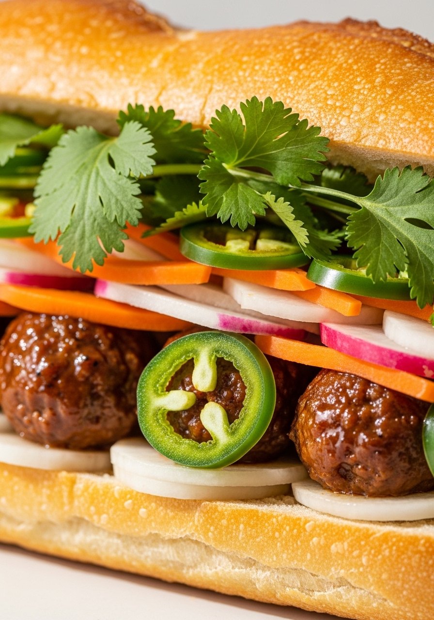 This fusion sandwich stuffs sticky soy-honey pork meatballs into a crisp baguette with pickles and herbs for crunch and tang. The glaze keeps meatballs shiny and flavorful. A bread knife slices the baguette cleanly.