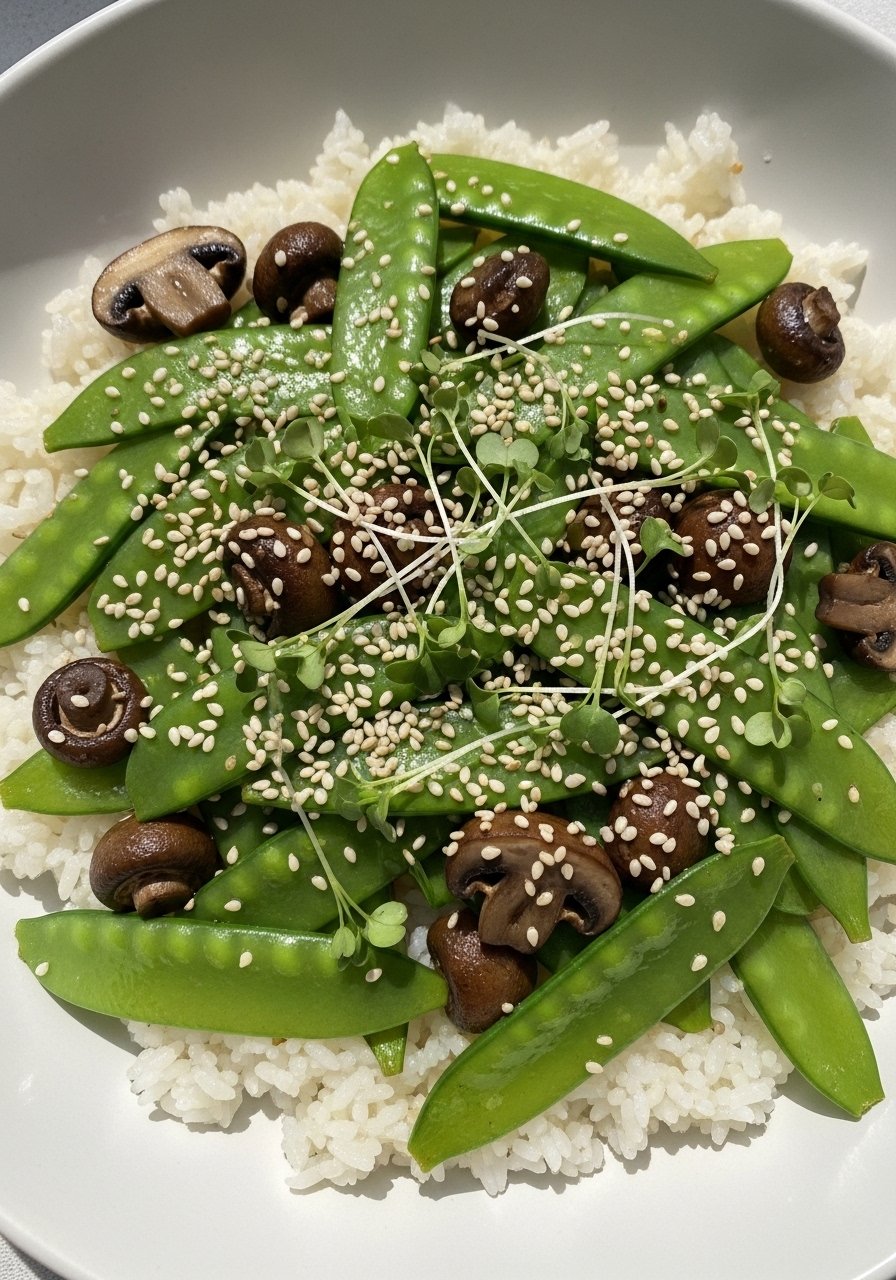 Earthy mushrooms with crunchy snow peas and a light soy-ginger glaze make this vegetarian rice bowl lively and satisfying.