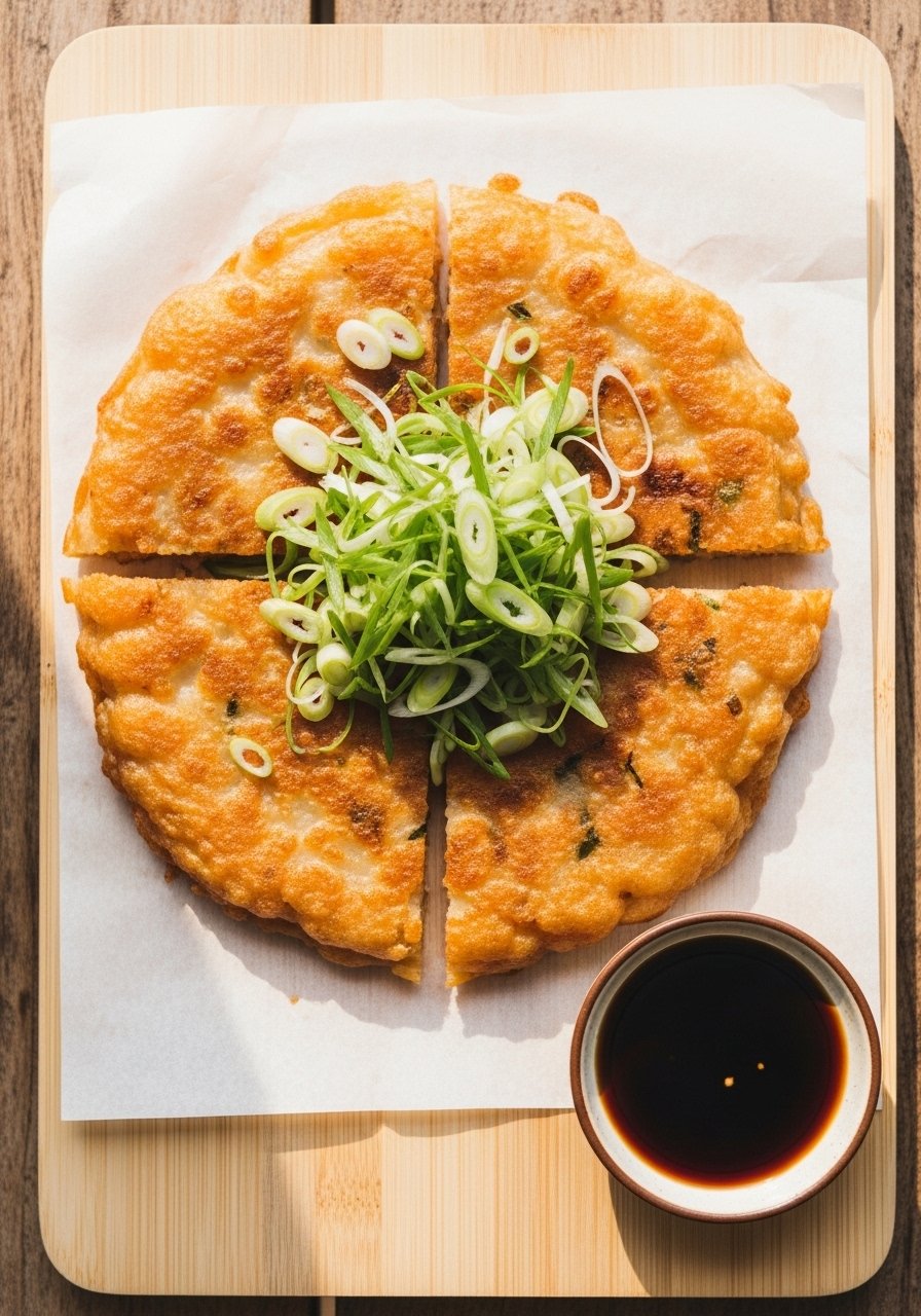 Slice into wedges and serve warm with a soy-vinegar dipping sauce. Keep extras stacked wrapped in foil and re-crisp in a hot skillet or on a baking sheet in a 350°F oven for 5 minutes. Freeze between parchment layers for up to 1 month.
