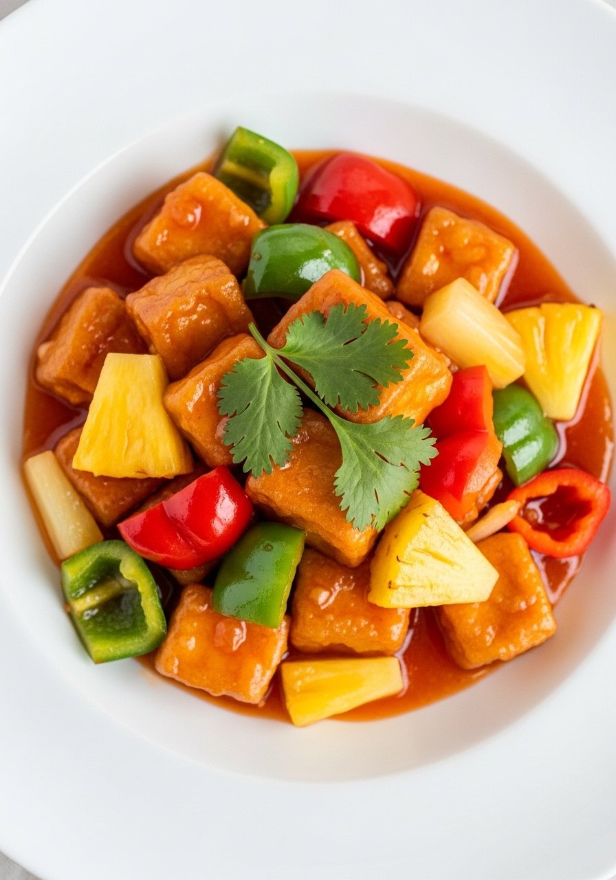 A vegetarian take on classic sweet-and-sour features crispy tofu and tangy pineapple sauce. Balanced sweetness with bright vinegar makes it family-friendly.