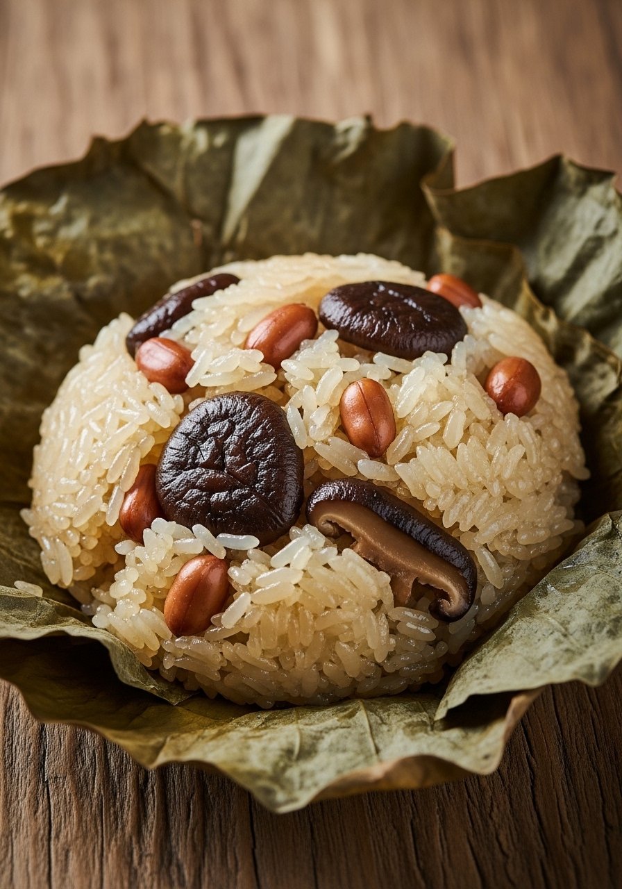 Wrapped in lotus leaf, sticky rice becomes fragrant and tender. This vegetarian lo mai fan uses mushrooms, peanuts, and chestnuts for texture.