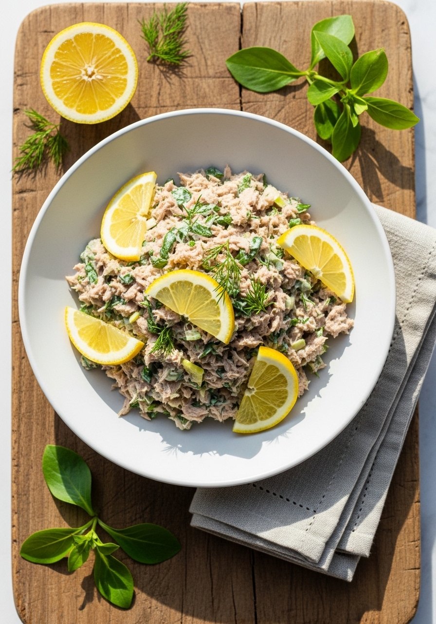 Light and citrusy, this version swaps most mayo for herbs and lemon for a fresher finish. Dill and lemon make the tuna pop, and capers add briny contrast. Perfect when you want a vibrant, bright easy tuna salad.