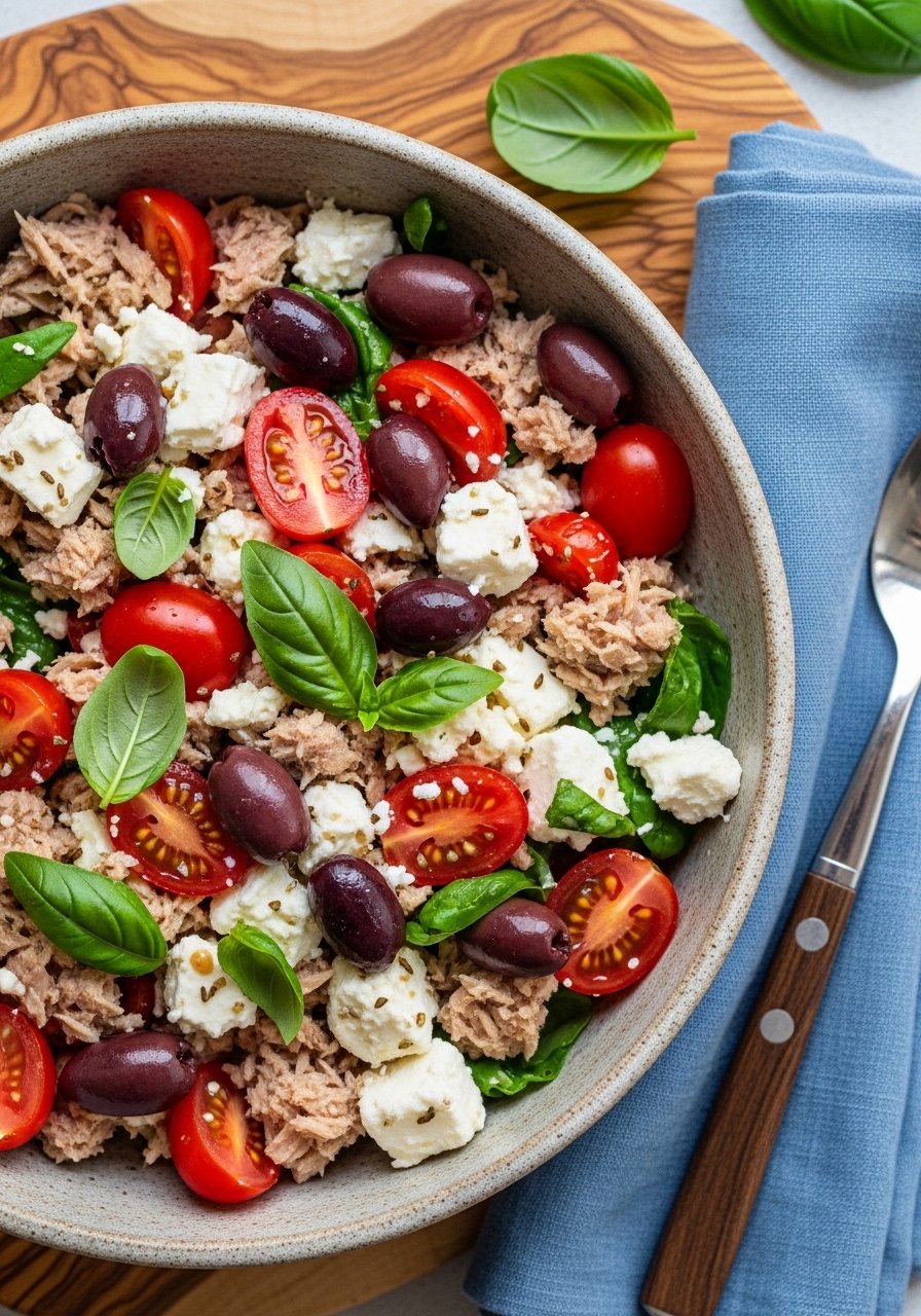 This savory easy tuna salad channels Mediterranean flavors—salty olives, tangy feta, and sun-dried tomato sweetness. It’s a great sandwich filler or a tossed salad topper that tastes like a light Greek meal.