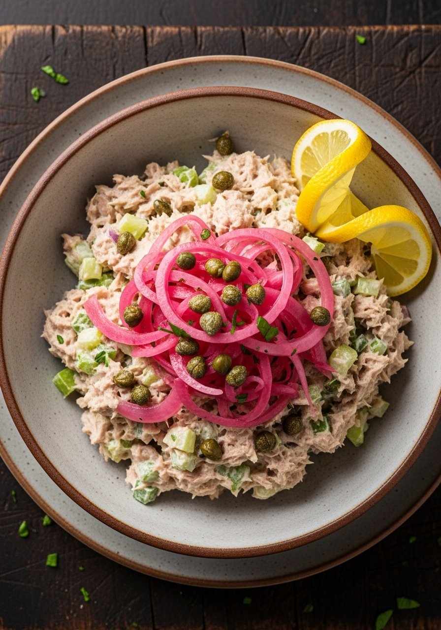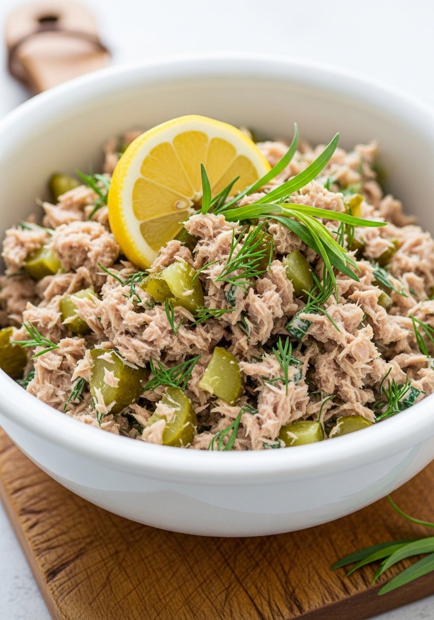 Tangy dill pickles and aromatic tarragon give this easy tuna salad a bright, slightly vinegary bite. It’s sharp, savory, and perfect for a lunchtime sandwich that wakes the palate.