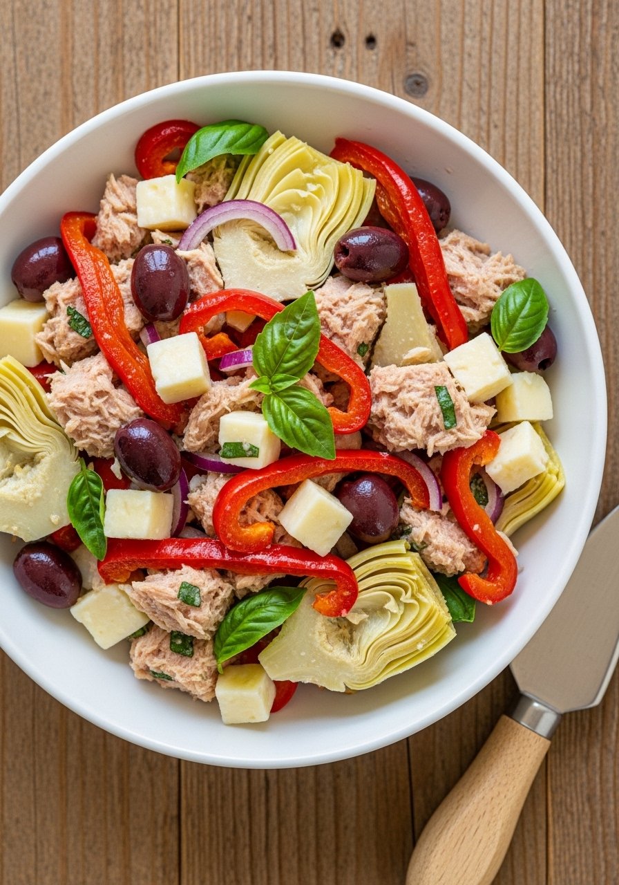 All the antipasto favorites—artichoke hearts, olives, and provolone—turn canned tuna into a party-ready salad. It’s bold, savory, and perfect for an easy appetizer or sandwich.