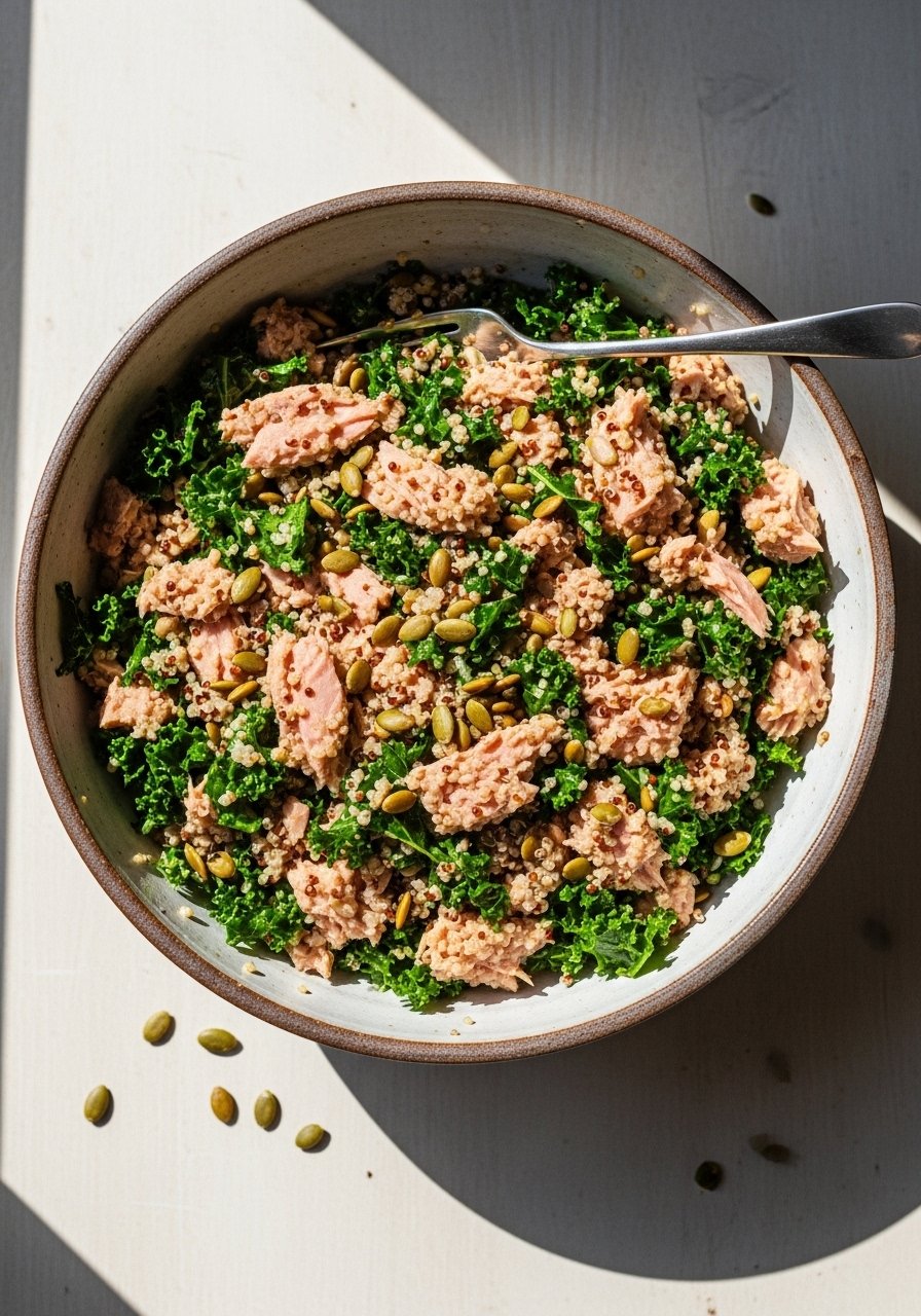 Packed with kale and quinoa, this superfood tuna salad is hearty and nutritious—great for make-ahead lunches. Toasted pepitas add crunch while lemon vinaigrette brightens everything.