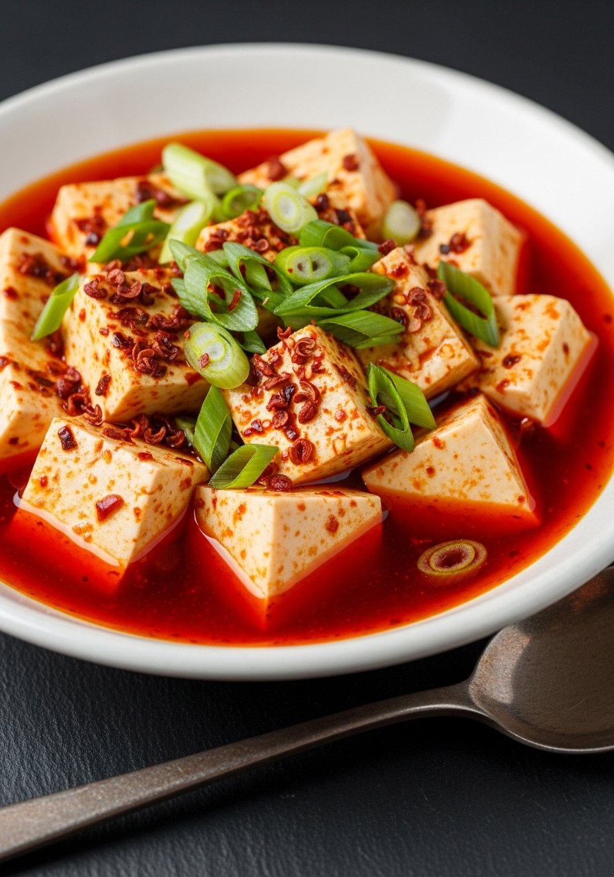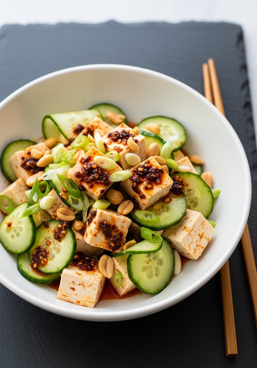 This chilled salad turns mapo-inspired flavors into a refreshing plate. Silken tofu soaks up a spicy, tangy dressing while crunchy cucumber and peanuts add contrast. It’s cool, spicy, and works as a side or light main.