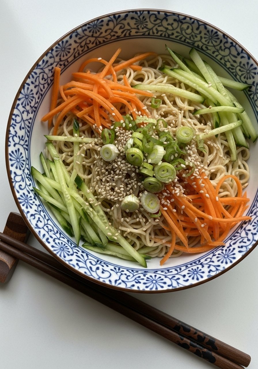 3. Toss noodles with dressing, cucumber, carrot, and scallions.