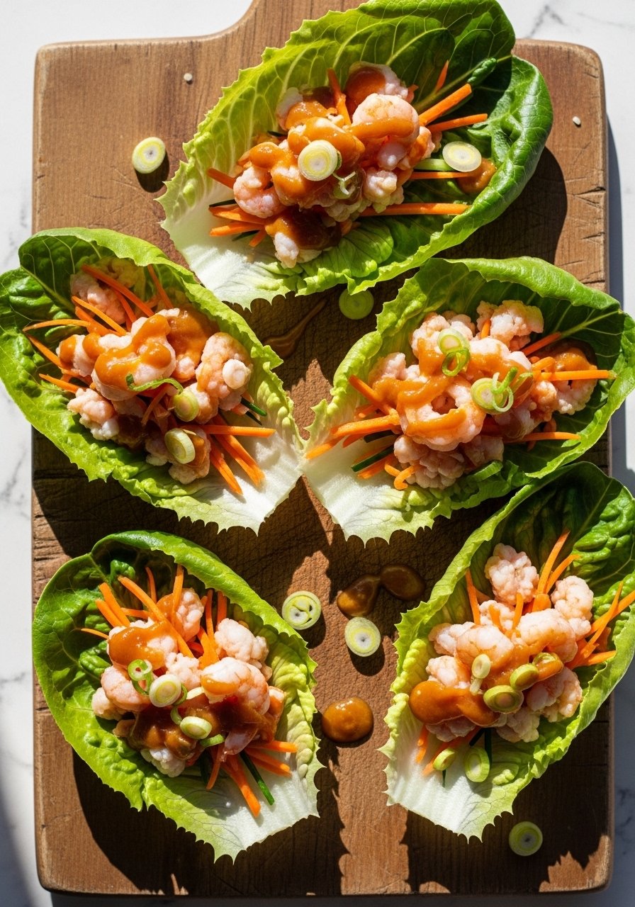 Serve immediately as an appetizer or light main. Use butter lettuce from the market; store wraps separately in glass meal prep containers for up to 1 day.