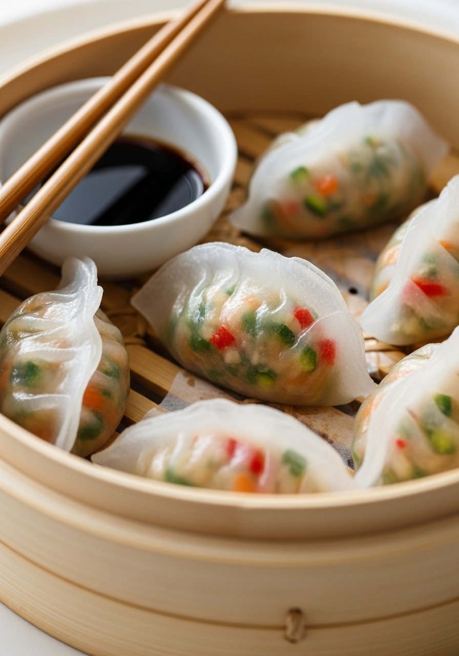 These dumplings are filled with vibrant vegetables and minimal oil. Steaming keeps them light while the wrappers become tender and slightly translucent.