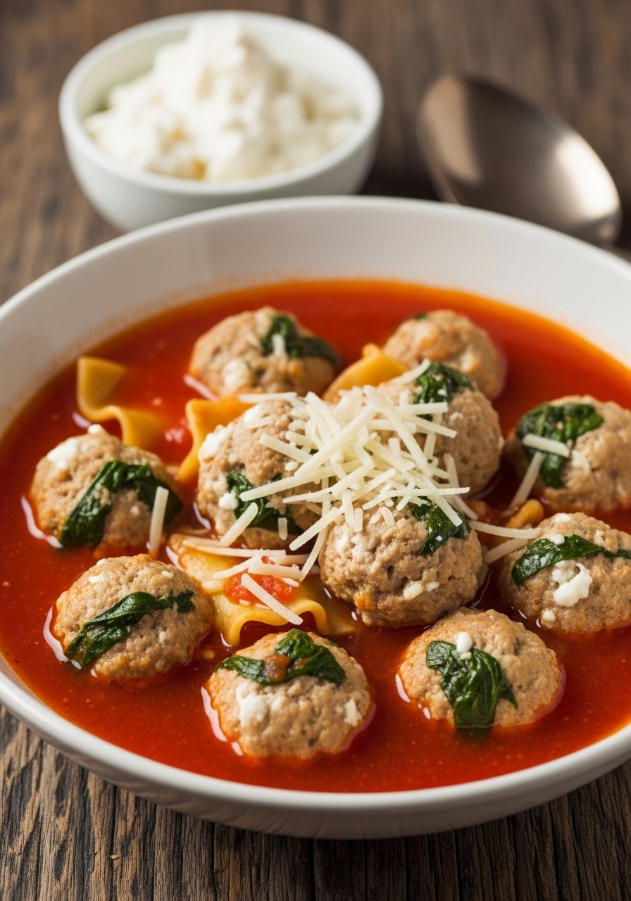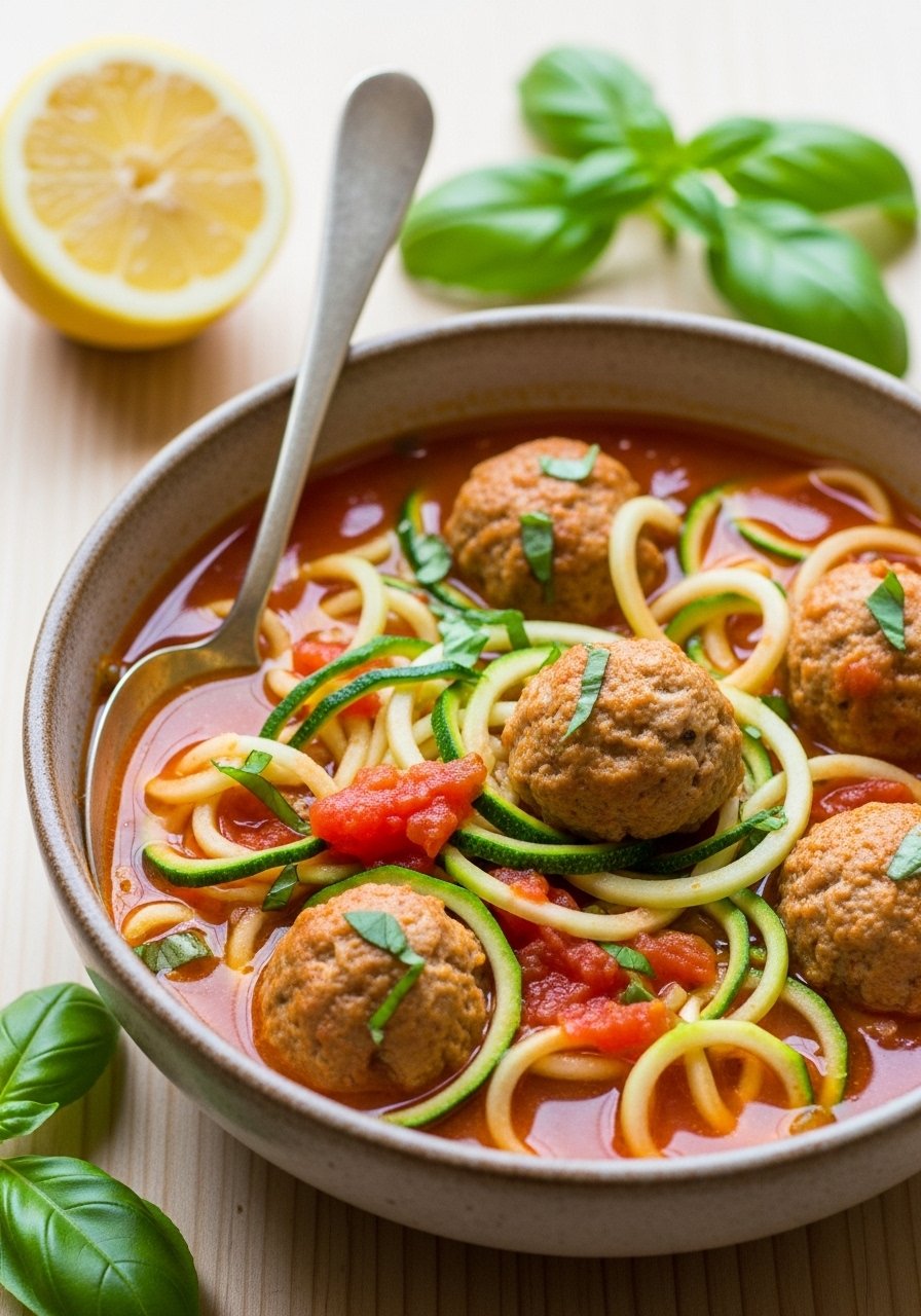 Swap pasta for zucchini noodles for a low-carb, lighter lasagna soup that still tastes indulgent. Ground turkey meatballs add protein while the zucchini keeps the texture bright and fresh. The broth is fragrant with basil and garlic.