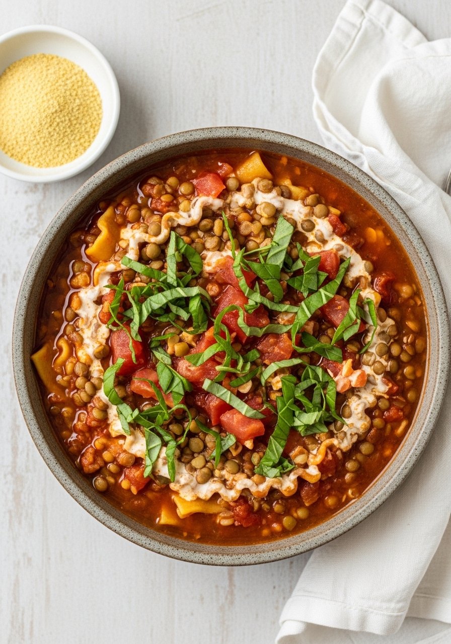Lentils mimic the bite of ground meat while adding fiber and plant protein. Nutritional yeast gives cheesy flavor without dairy. This vegan lasagna soup is thick, earthy, and deeply satisfying for cooler nights.