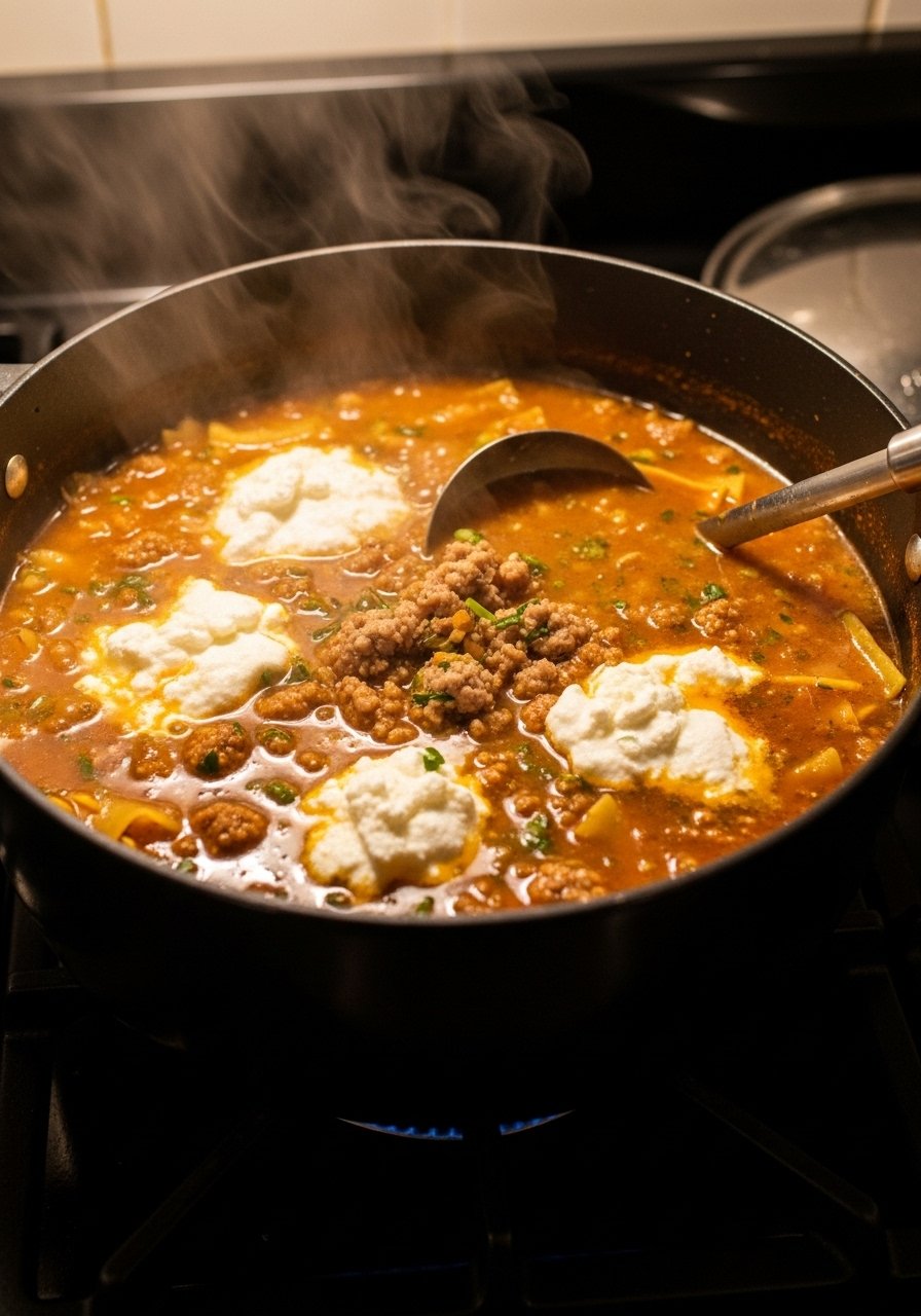 4. Add broken lasagna noodles, cook 8–10 minutes until tender.