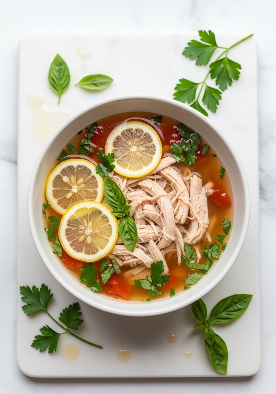 Lemon and fresh herbs lighten the traditional profile, giving the soup a bright finish that balances tomato richness. Shredded chicken keeps it lean and family-friendly.