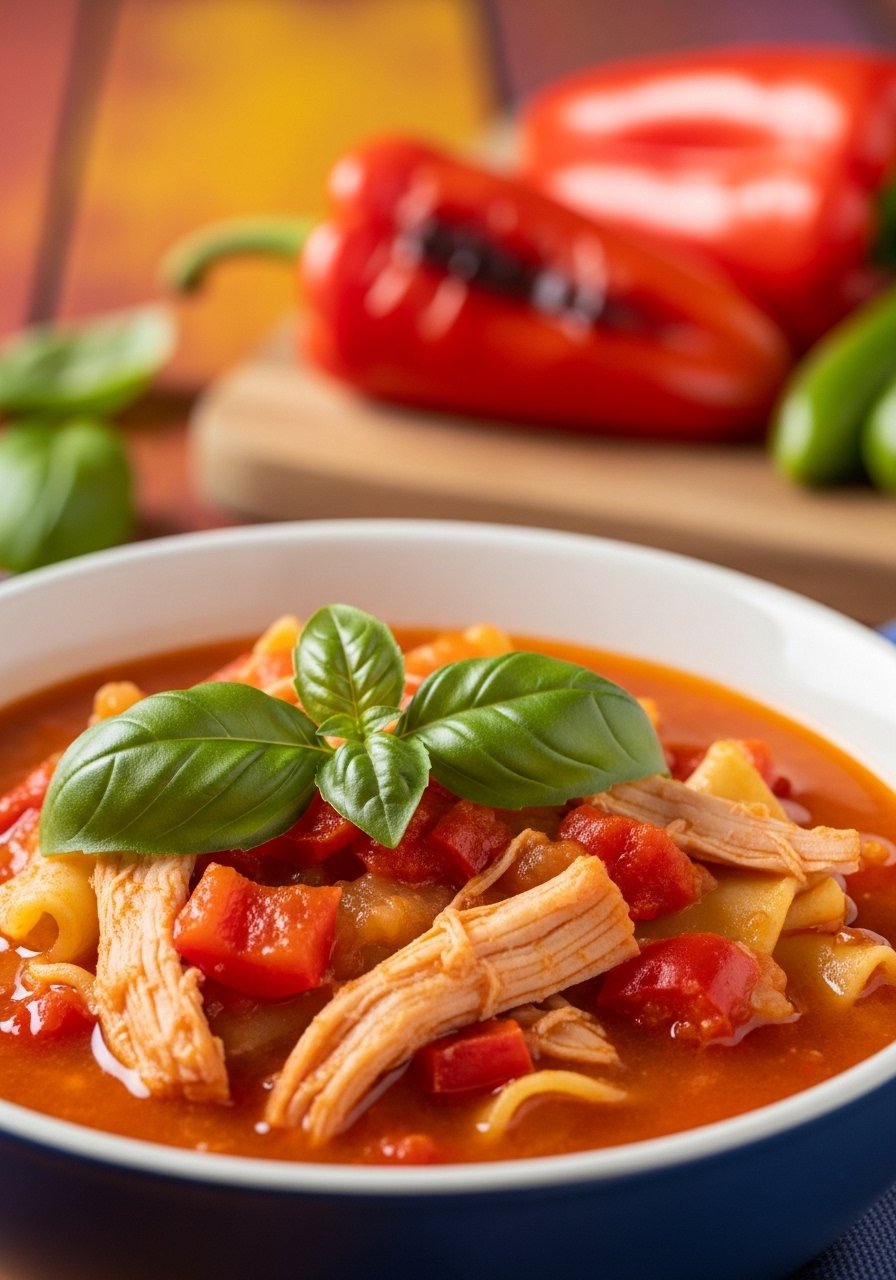 Roasted red peppers add smoky sweetness and color. Combined with shredded turkey, this soup is bright, slightly sweet, and very satisfying.