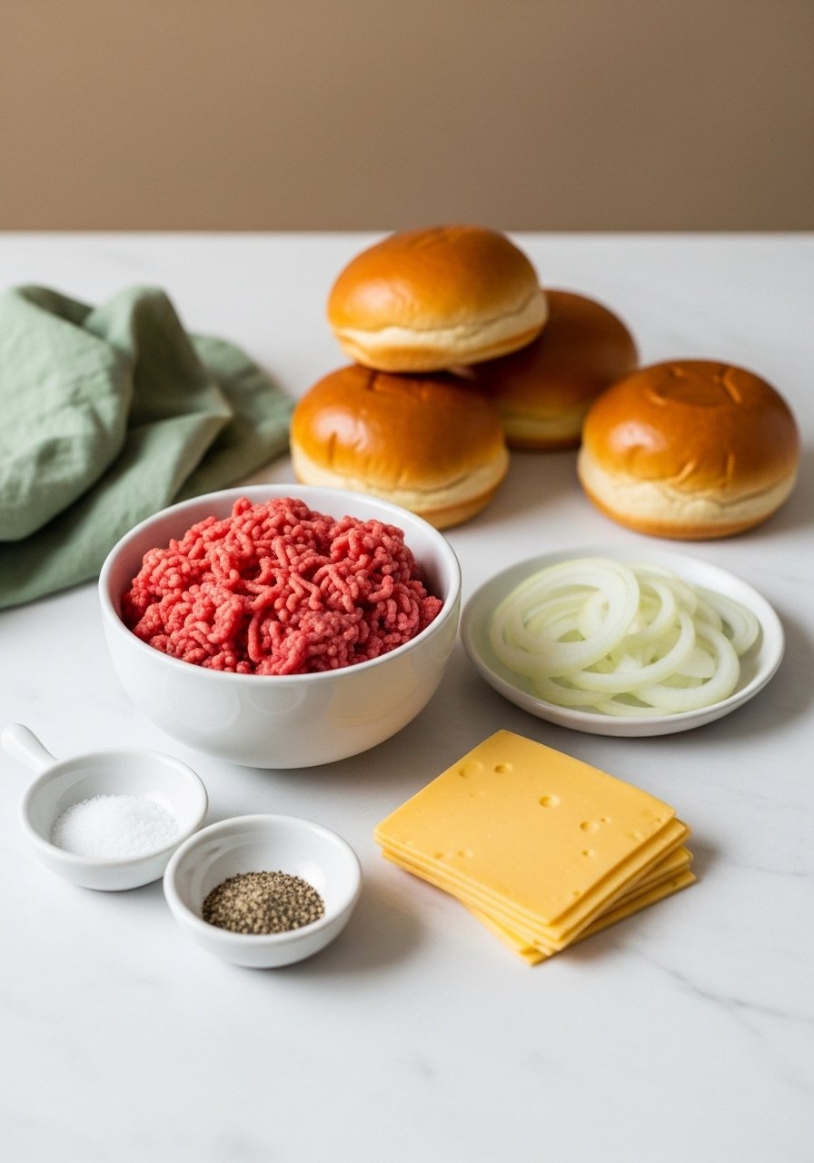 - Gather: buns, sliced American or cheddar cheese, thin-sliced onions, and soft butter for toasting.