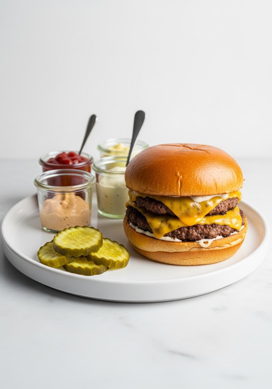Assemble simply: toasted bun, burger, pickles, onions, and a swipe of sauce. Keep toppings light so the crust stays the star.