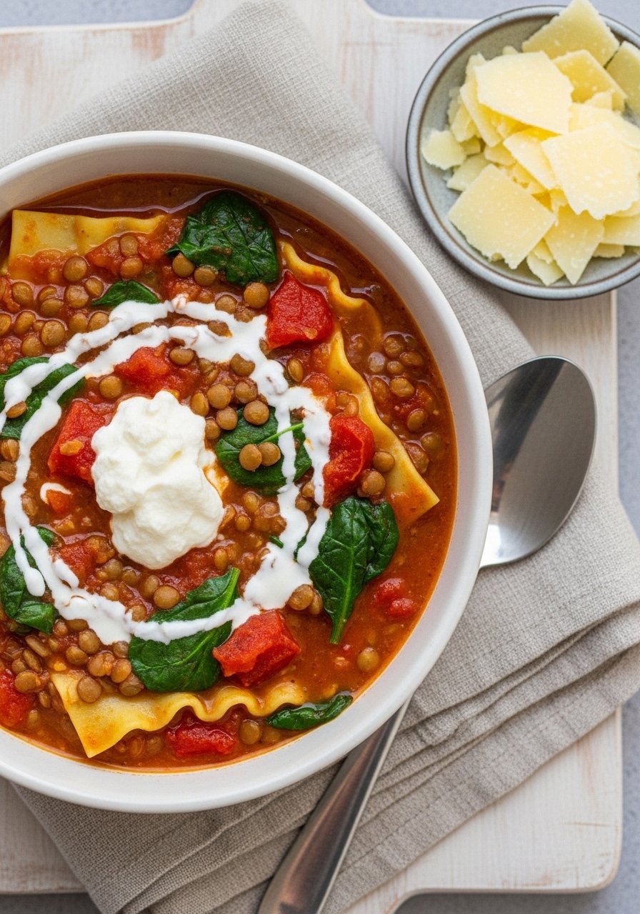 This meat-free lasagna soup swaps ground meat for brown lentils, adding fiber and a meaty texture without animal protein. It's tomato-forward, richly seasoned, and keeps well for lunches. If you're using dried lentils, a fine-mesh strainer is handy for rinsing them quickly.
