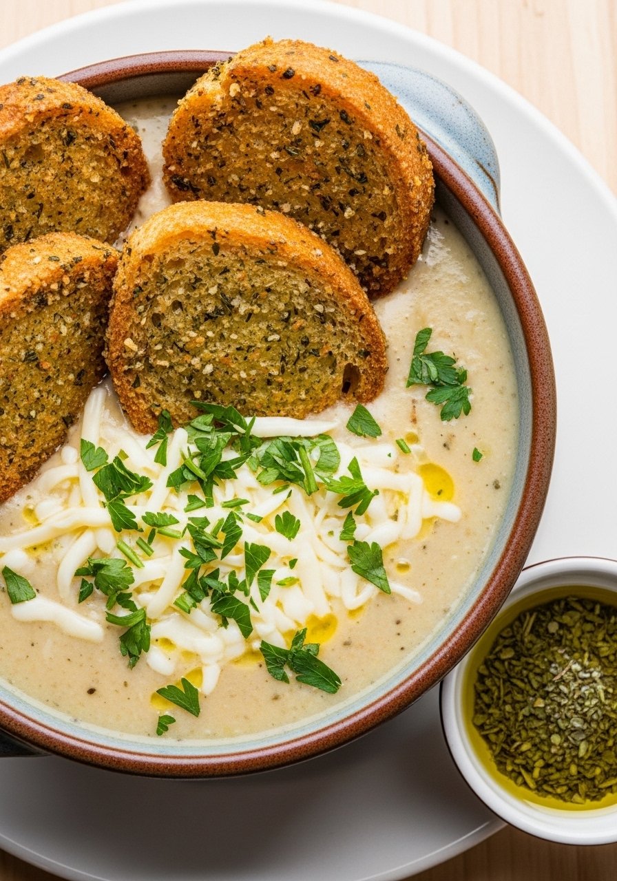 This final version emphasizes crunch: herb-crusted croutons add a toasted, garlicky bite that’s perfect against a creamy soup. It’s great for serving to guests.