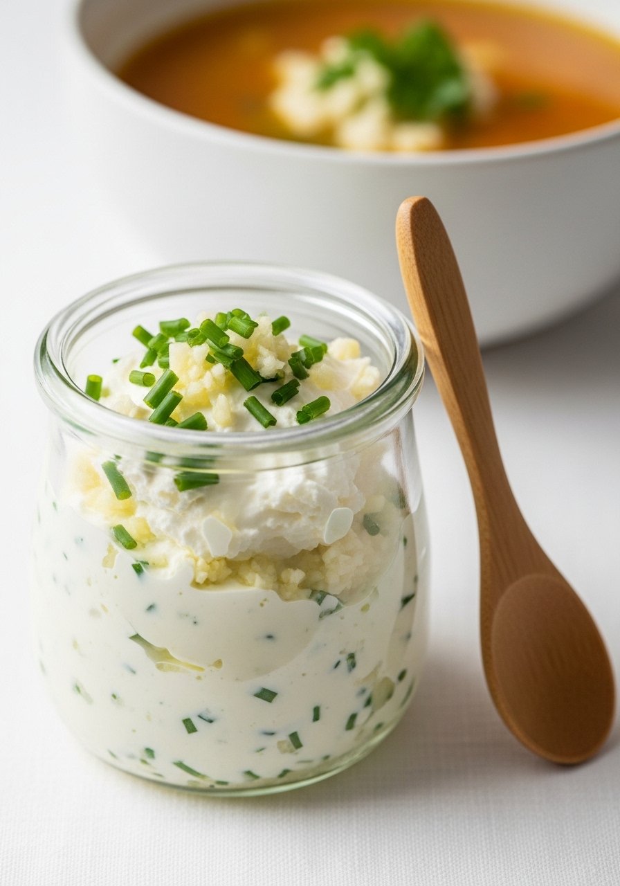 This silky, tangy crème fraîche with garlic and chives adds cooling richness and fresh herbal lift. It’s creamy and tang-forward—perfect for balancing hot, starchy potato soup.