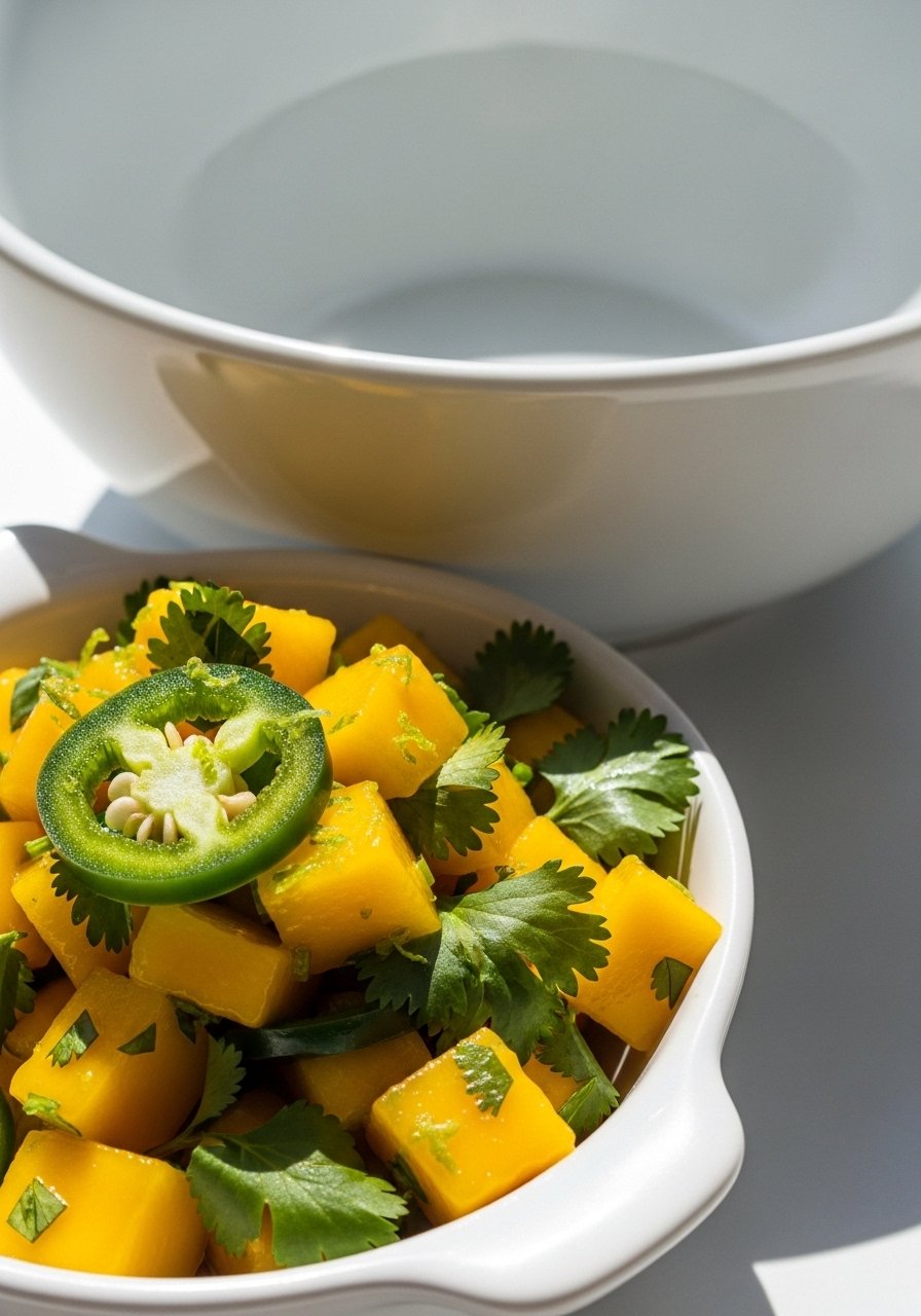 Sweet mango with cilantro and lime creates a fresh, tropical relish that adds brightness and a silky-sweet contrast to potato soup.