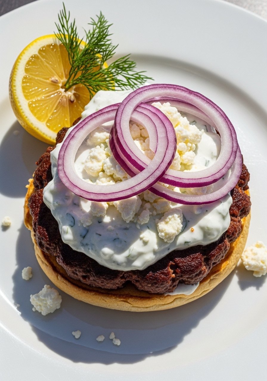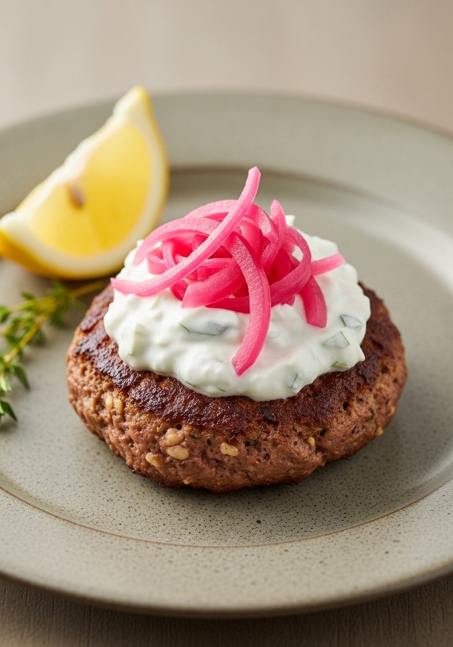 - Assemble: spread tzatziki, place lamb patty, top with pickled onions.
