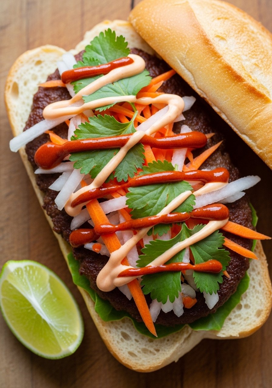Banh mi flavors — tangy pickles, fresh cilantro, and spicy mayo — translate beautifully to a smash burger. The pickled veggies add crunch and tang that cut through the beef.