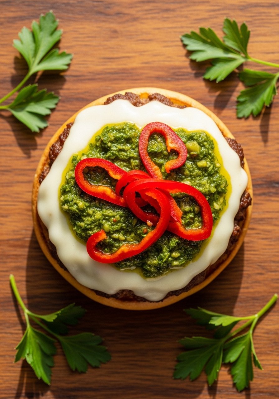 - Place pickled red peppers atop the cheese, then drizzle chimichurri over the patty.