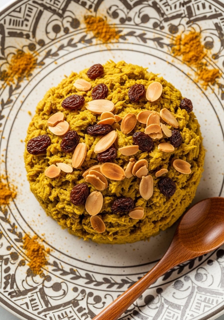 Warm curry powder and sweet raisins create a comforting, slightly exotic profile. Toasted almonds give crunch. This is great on sandwiches or apples. I toast nuts quickly on a non-stick skillet for even color.
