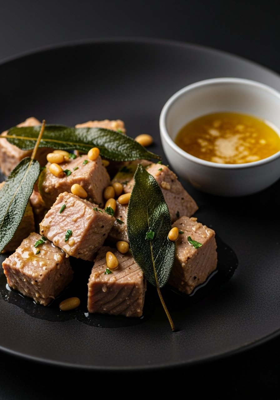 - Drizzle brown butter over tuna and fold in pine nuts.
